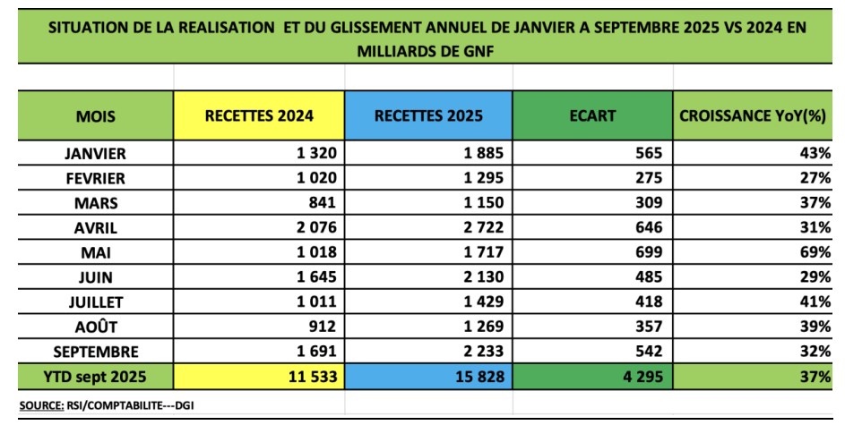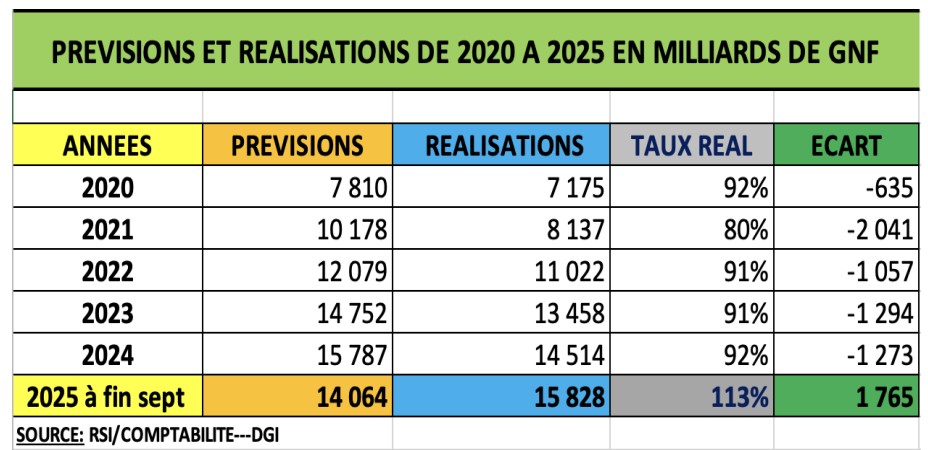 Une analyse des tableaux de performance de la Direction Générale des Impôts (DGI) en glissement annuel de 2020 à septembre 2025 permet de tirer les conclusions suivantes :