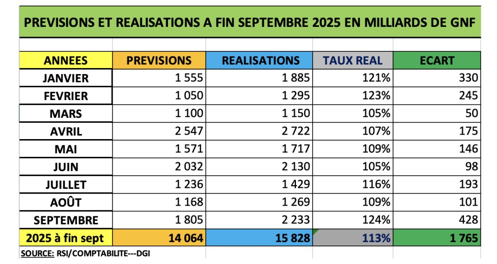 Pour la première fois sur la période observée, les réalisations à fin septembre dépassent les prévisions (15 828 vs 14 064 milliards GNF), avec un taux de réalisation de 113%.