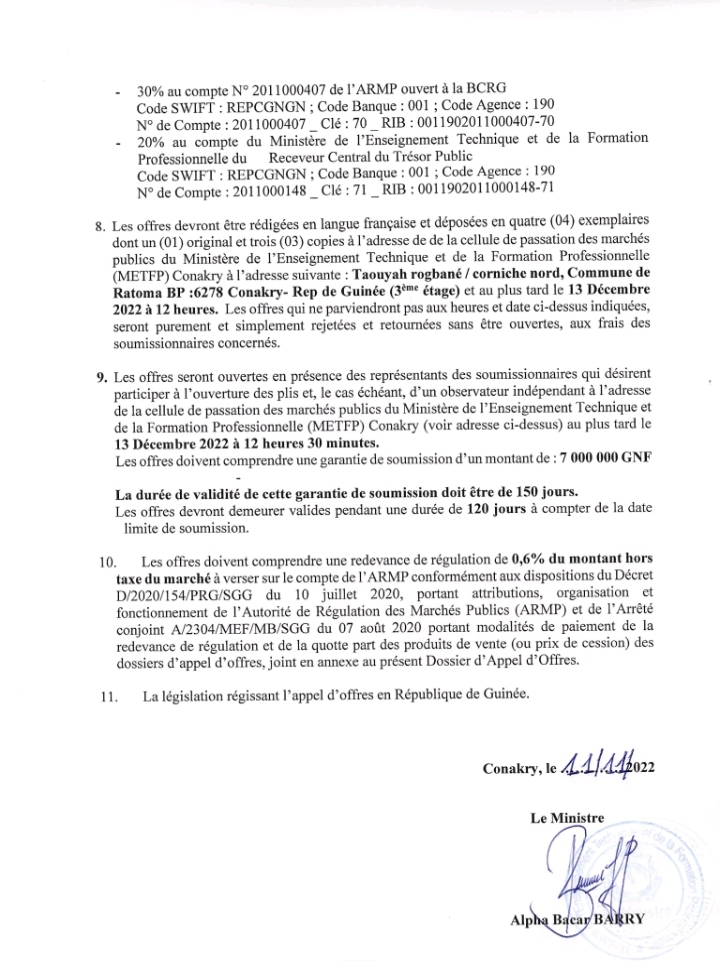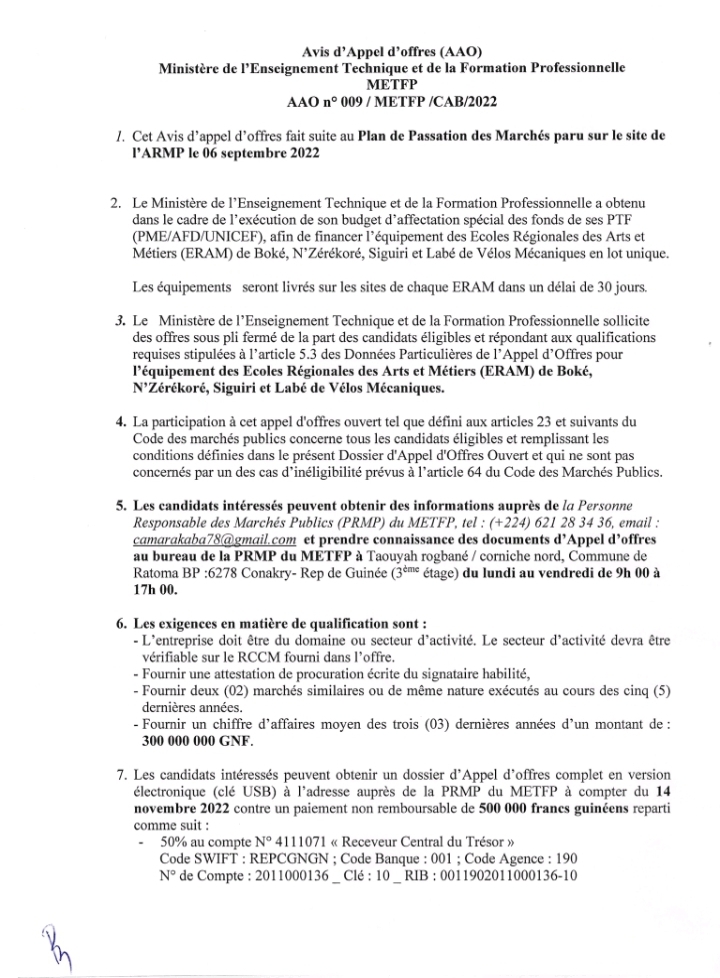 Le Ministère de l’Enseignement Technique et de la Formation Professionnelle sollicite des offres sous pli fermé de la part des candidats éligibles et répondant aux qualifications requises stipulées à l’article 5.3 des Données Particulières de l’Appel d’Offres pour l’équipement des Écoles Régionales des Arts et Métiers (ERAM) de Boké, N’Zérékoré, Siguiri et Labé de Vélos Mécaniques.
