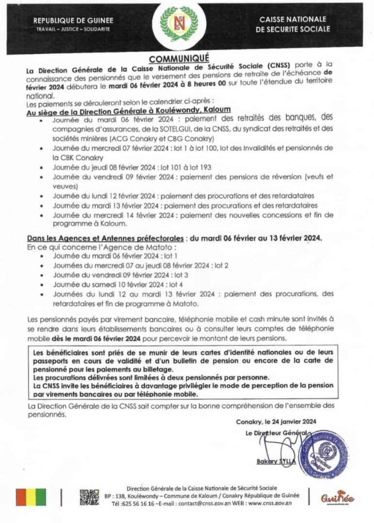 Les pensionnés payés par virement bancaire, téléphonie mobile et cash minute sont invités à se rendre dans leurs établissements bancaires ou à consulter leurs comptes de téléphonie mobile dès le mardi 06 février 2024 pour percevoir le montant de leurs pensions.