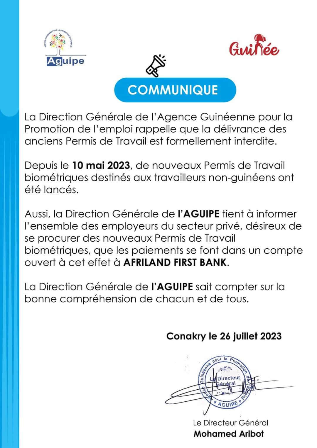 La Direction Générale de l’Agence Guinéenne pour la Promotion de l’emploi rappelle que la délivrance des anciens Permis de Travail est formellement interdite.