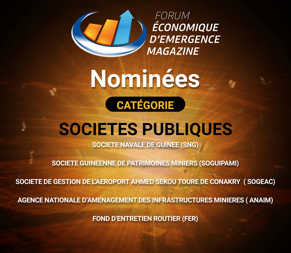 Conakry, le 27 janvier 2025 : Le Magazine Émergence a publié ce jour, les cinq (5) nominés dans les catégories « Meilleure Société Publique » et « Meilleure Compagnie d’Assurance ». Le vainqueur dans chaque catégorie sera annoncé le 21 février prochain à Conakry, à l’occasion des Emergences Awards qui viendront clôturer la 3ème édition du Forum Économique d’Émergence Magazine.