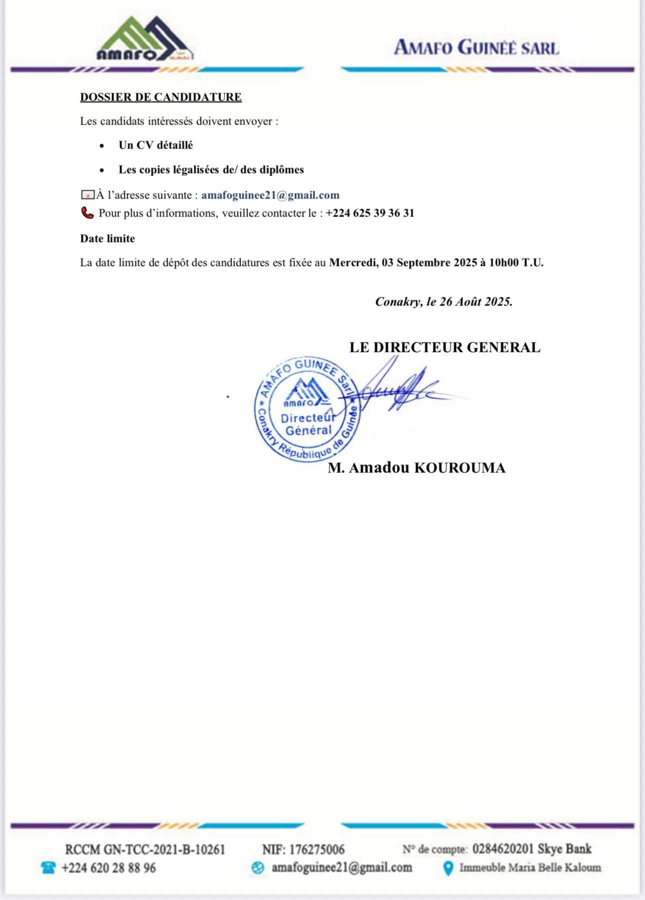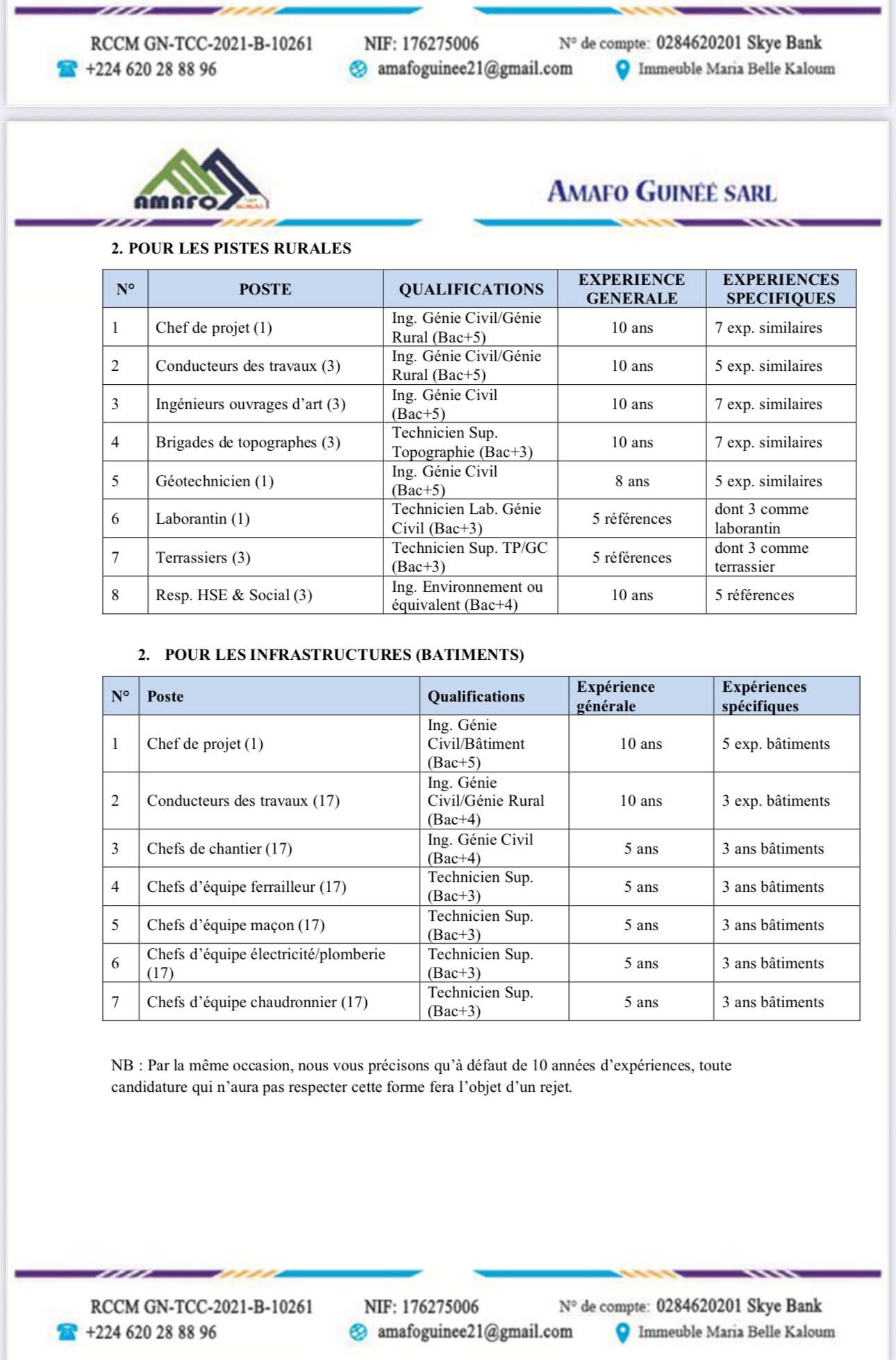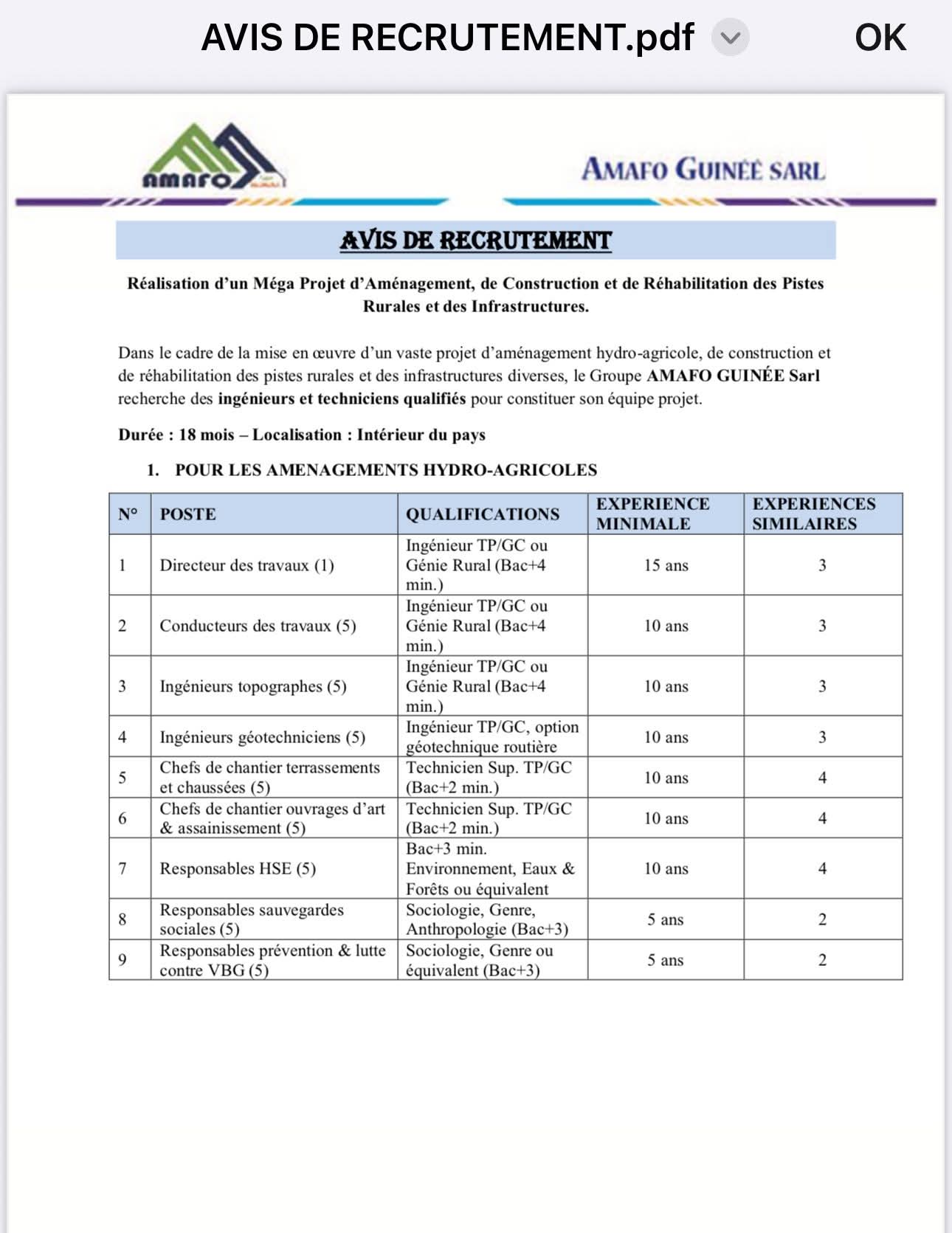 Dans le cadre de la mise en œuvre d’un important projet d’aménagement hydro-agricole, de construction et de réhabilitation de pistes rurales ainsi que d’autres infrastructures, le Groupe AMAFO GUINÉE Sarl lance un appel à candidatures pour le recrutement d’ingénieurs et de techniciens qualifiés en vue de constituer son équipe projet.