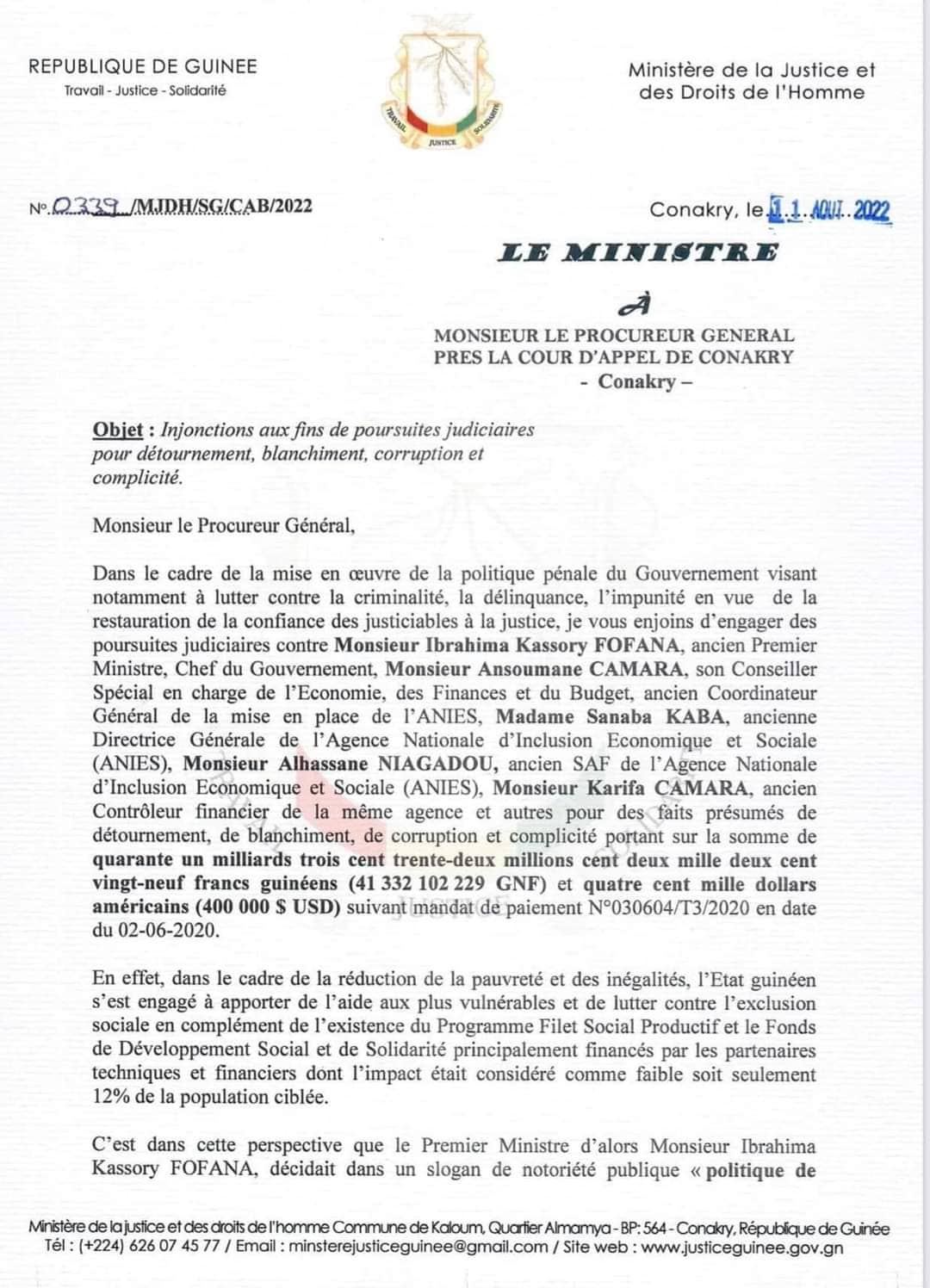 Dans un courrier qu’il a adressé au Procureur général près la Cour d’Appel de Conakry et dont l’objet est ainsi libellé : « Injonctions aux faits de poursuites judiciaires pour détournement, de blanchiment, de corruption et complicité », le ministre de la Justice saisit celui-ci à l’effet d’engager des poursuites judiciaires contre l’ex-chef du gouvernement Ibrahima Kassory Fofana. A Kassory Fofana, il ajoute son Conseiller spécial en charge de l’Economie, des Finances et du Budget et alors, Coordinateur de l’ANIES Ansoumane Camara, l’ancienne directrice générale de l’ANIES Madame Sanaba Kaba ainsi que l’ancien SAF de l’agence Alhassane Niagadou et l’ancien contrôleur financier Karifa Camara.