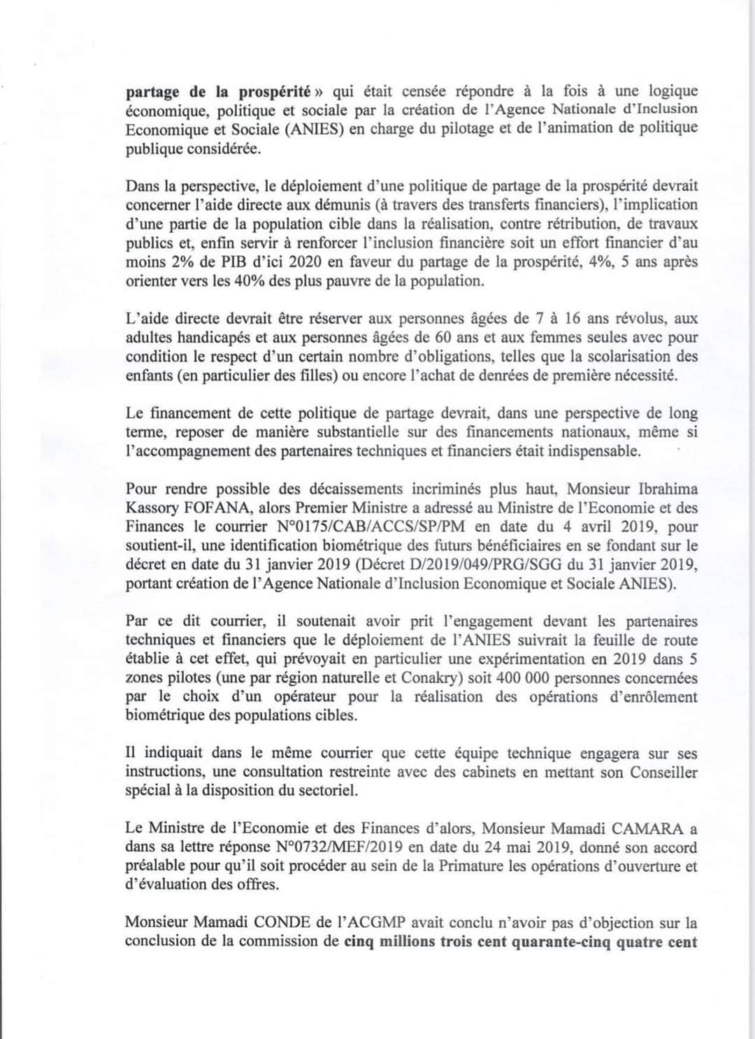 Pour le ministre de la Justice, l’aide directe planifiée dans le cadre des opérations de l’ANIES qui devait aider à lutter contre l’extrême pauvreté dans le pays a été détournée de ses objectifs. « Le financement de cette politique de partage devrait, dans une perspective de long terme, reposer de manière substantielle sur des financements nationaux même si l’accompagnement des partenaires techniques et financiers était indispensable », dit-il dans sa correspondance. « Plusieurs montants ont été décaissés sans impact réel sur la vie des populations cibles autour desquels subsistent des indices concordants laissant croire au-delà de tous doutes raisonnables qu’ils ont été détournés, blanchis et utilisés à d’autres fins ».