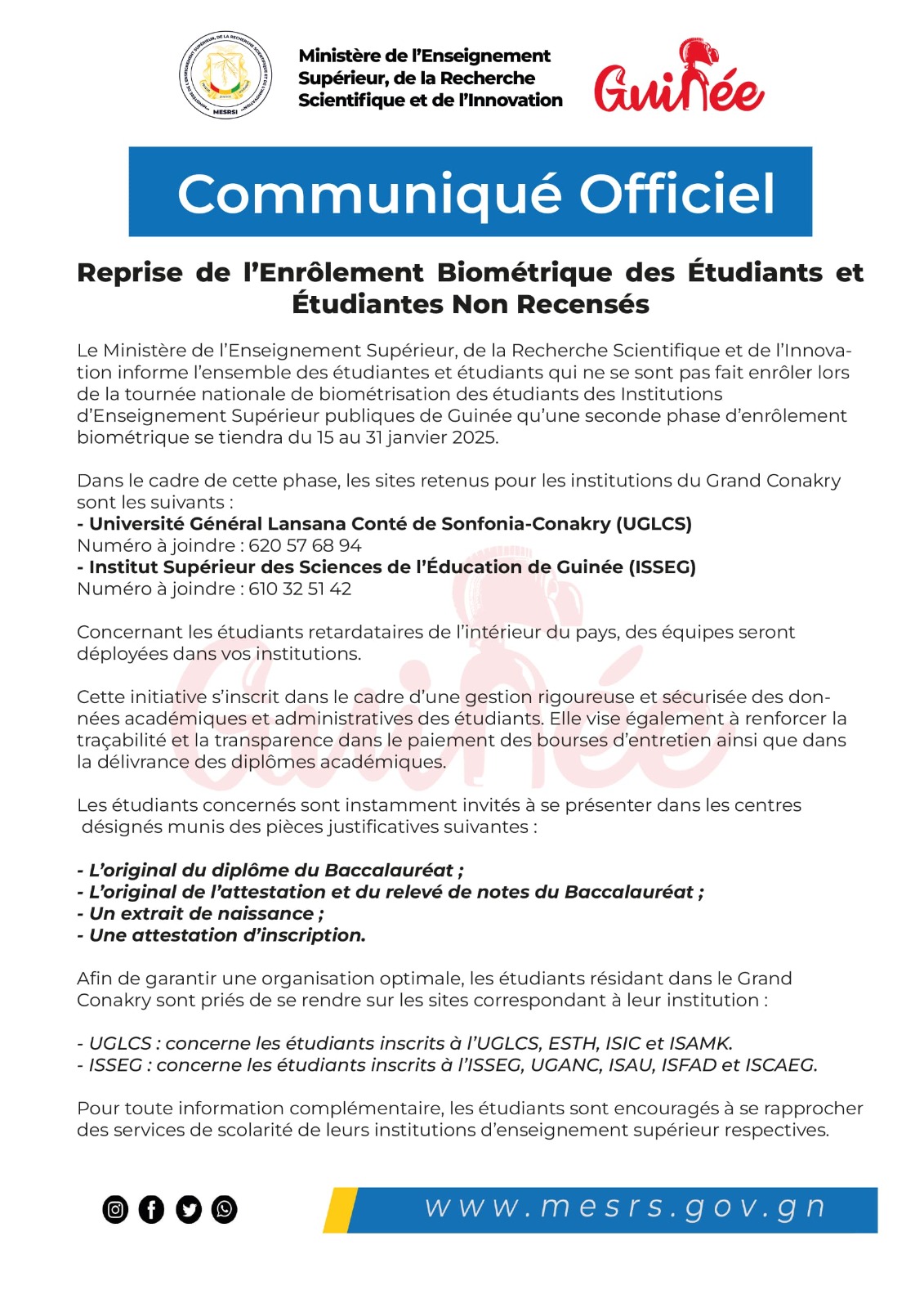Le Ministère de l’Enseignement Supérieur, de la Recherche Scientifique et de l’Innovation informe l’ensemble des étudiantes et étudiants qui ne se sont pas fait enrôler lors de la tournée nationale de biométrisation des étudiants des Institutions d’Enseignement Supérieur publiques de Guinée qu’une seconde phase d’enrôlement biométrique se tiendra du du 15 au 31 janvier 2025.