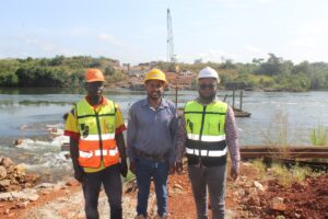 Sur le chantier de la construction du pont, un peu plus en bas à environ 1km, l’on constate que le pont aura quatre appuis dont des culées sur chaque extrémité (C0 et C3) et deux piles (P1 et P2) qui doivent supporter la poutrelle. Sur chaque pile, on a environ 15 pieux. «Les culées sont terminées, donc deux appuis sont terminés. Troisième appui terminé aussi, on est en train de finir les injections. D’ici la fin de novembre, tout sera terminé. Vous allez voir les pieux qui seront debout et on attend, comme vous voyez que le niveau de l’eau est un peu élevé, on ne veut pas mettre du remblai, parce que dès que vous mettez du remblai, ça part avec la pluie. Ce qu’on va faire, c’est qu’on va attendre encore une semaine pour regarder si l’eau baisse, on va refaire la piste dans le fleuve pour repartir avec les grues, il reste trois pieux à finir sur la pile P2 dans le fleuve, 12 pieux sont déjà faits. Une fois que ce sera fini, on vient, on casse le béton qui est là parce qu’on avait un béton un peu plus haut pour pouvoir forer avec la machine et après on vient faire la semelle, ferraillée la semelle, faire la semelle et après on vient mettre les pieux. Une fois que les pieux sont terminés, on viendra faire le lançage. La structure métallique est déjà faite», explique le Directeur Travaux de Leduc et responsable de ce projet pour Leduc, Prithiviraj Ramat.