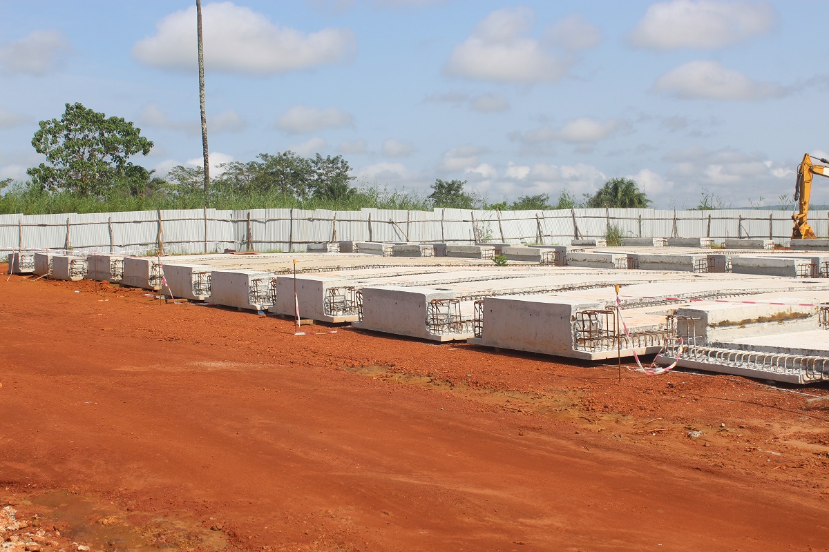 Ici à la base technique, on voit 49 dalles fabriquées sur les 52 dalles que le pont va contenir. Des ferrailleurs sont en train de faire les assemblages de fers pour les trois dalles restantes et qui doivent être coulées la semaine suivante. Une dalle pèse 23 tonnes. Après, ces dalles seront posées quand tous les pieux seront terminés. D’ici fin janvier 2024, dit le responsable de LEDUC, tout sera terminé et début février, ils vont lancer le pont ou pousser la structure métallique.