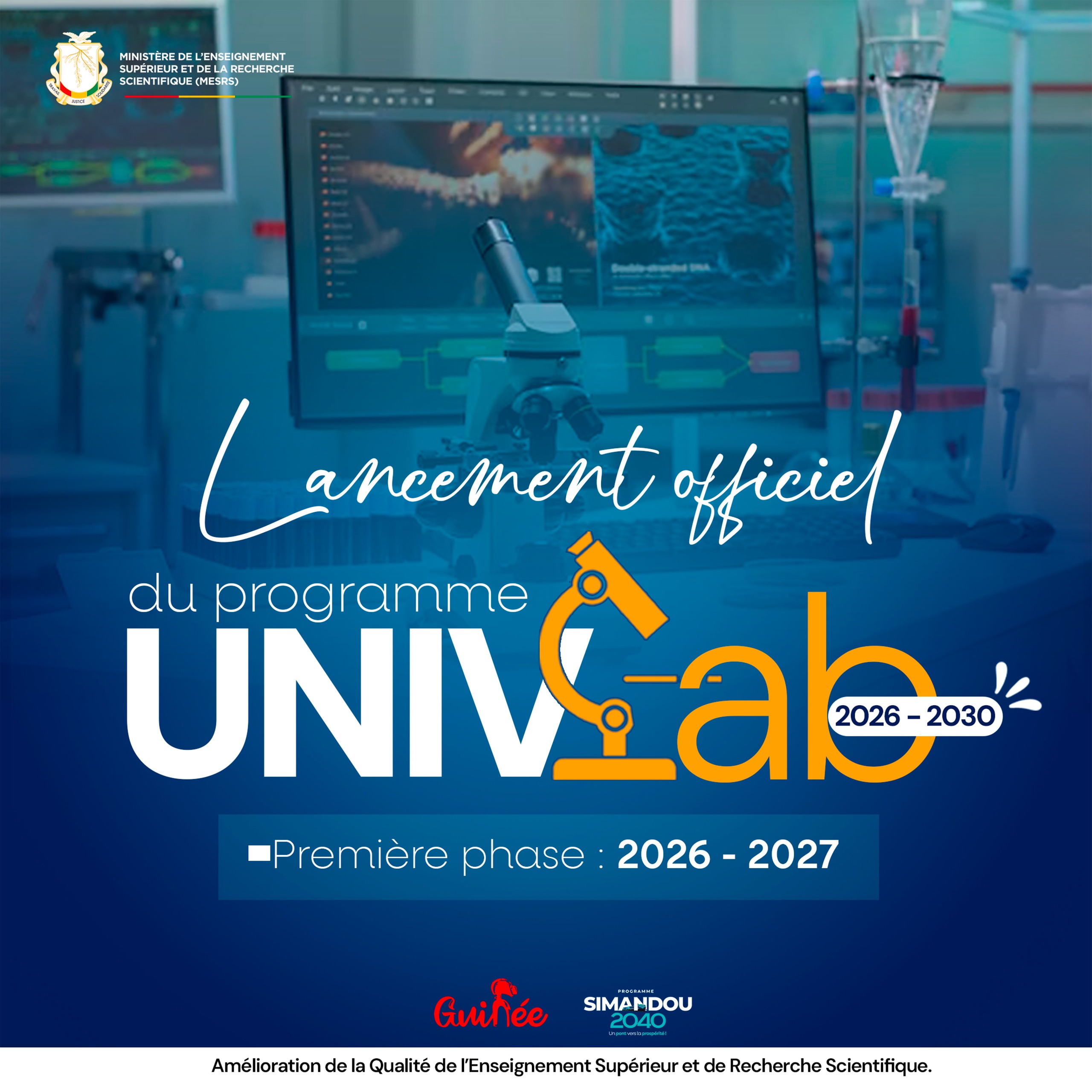 Le Ministère de l’Enseignement Supérieur et de la Recherche Scientifique annonce le lancement du Programme UNIV’LAB, Une initiative structurante portée par Madame la ministre, Dre Diaka SIDIBE, destinée à moderniser les laboratoires pédagogiques et scientifiques des Institutions d’Enseignement Supérieur (IES) et des Institutions de Recherche Scientifique (IRS) en Guinée.